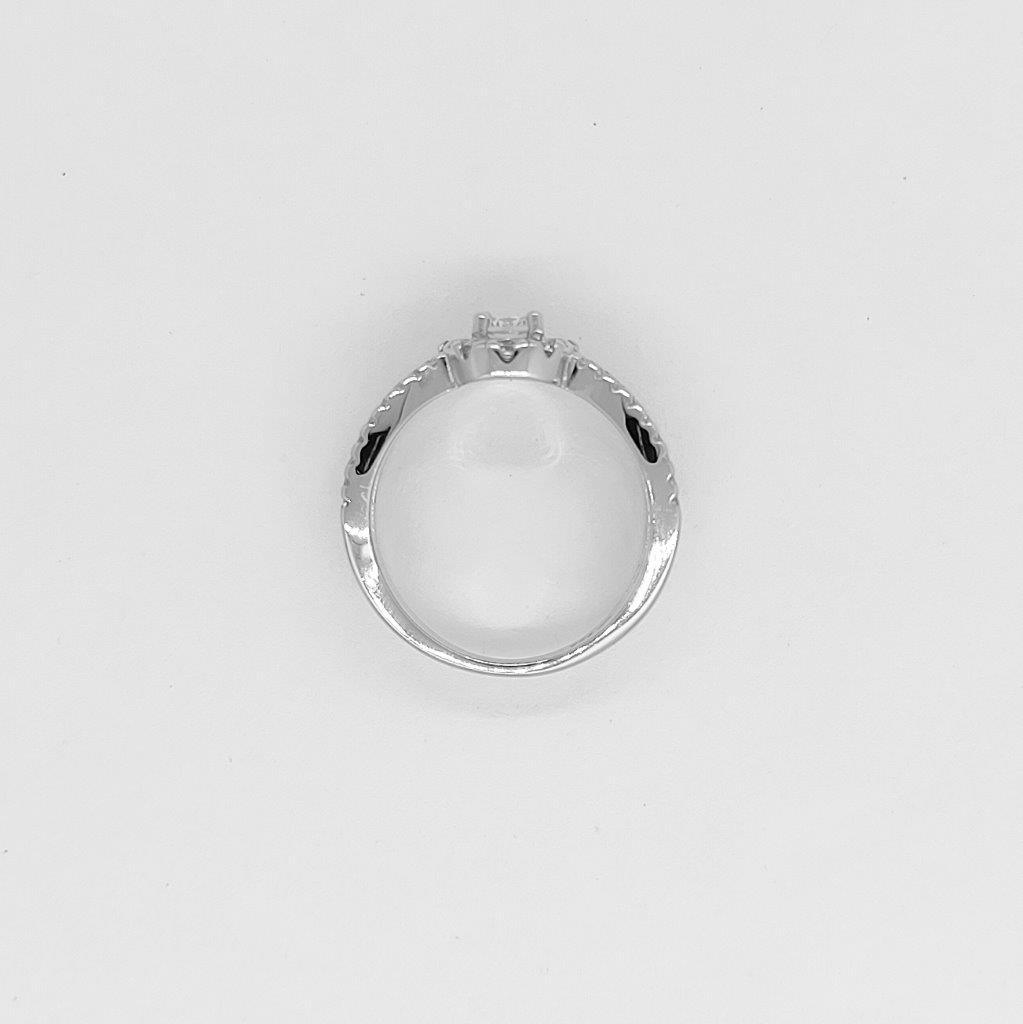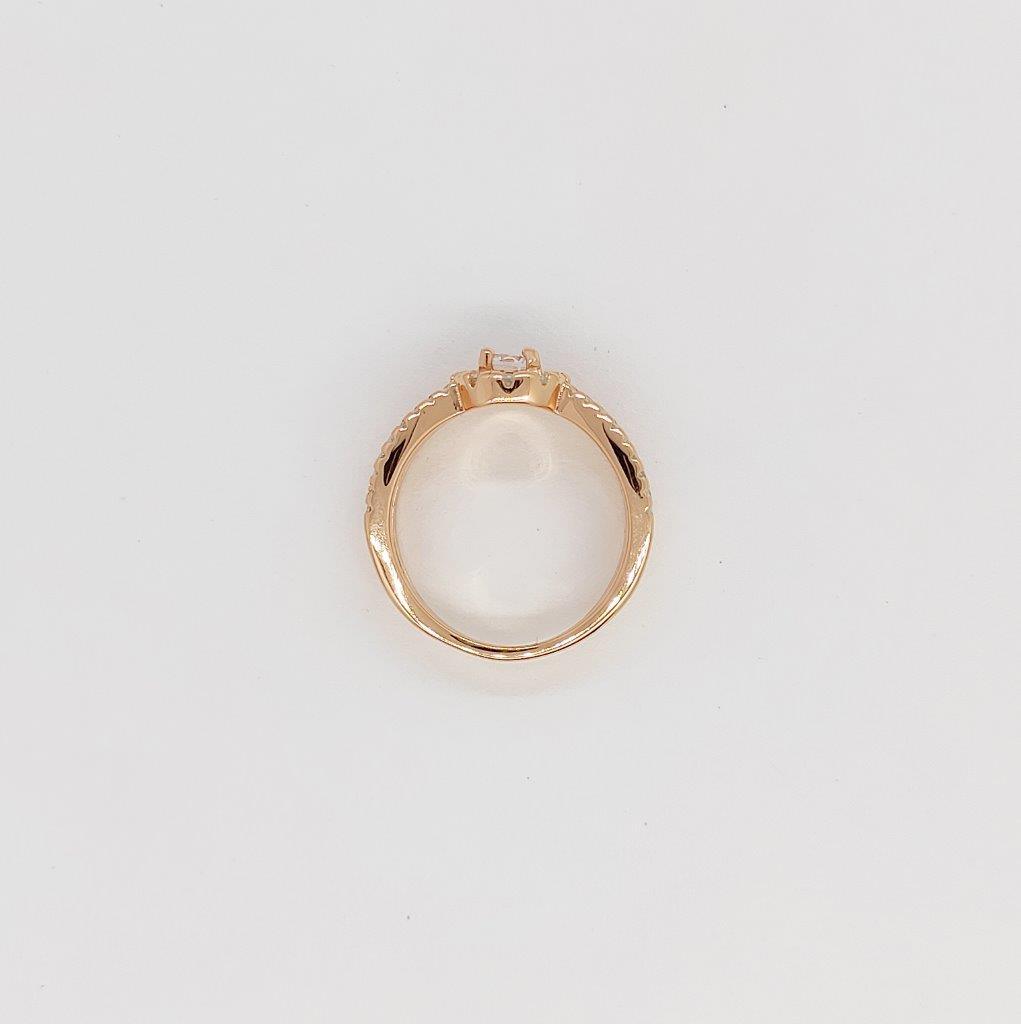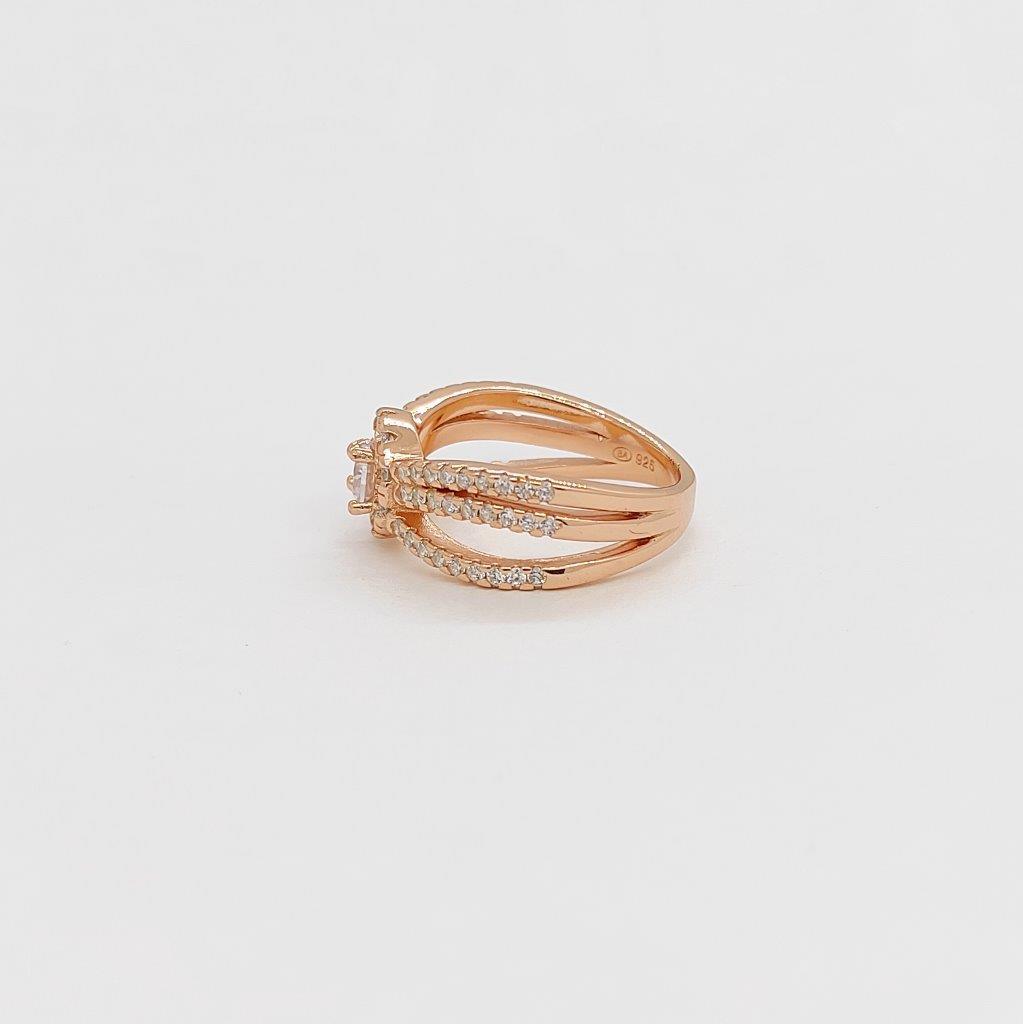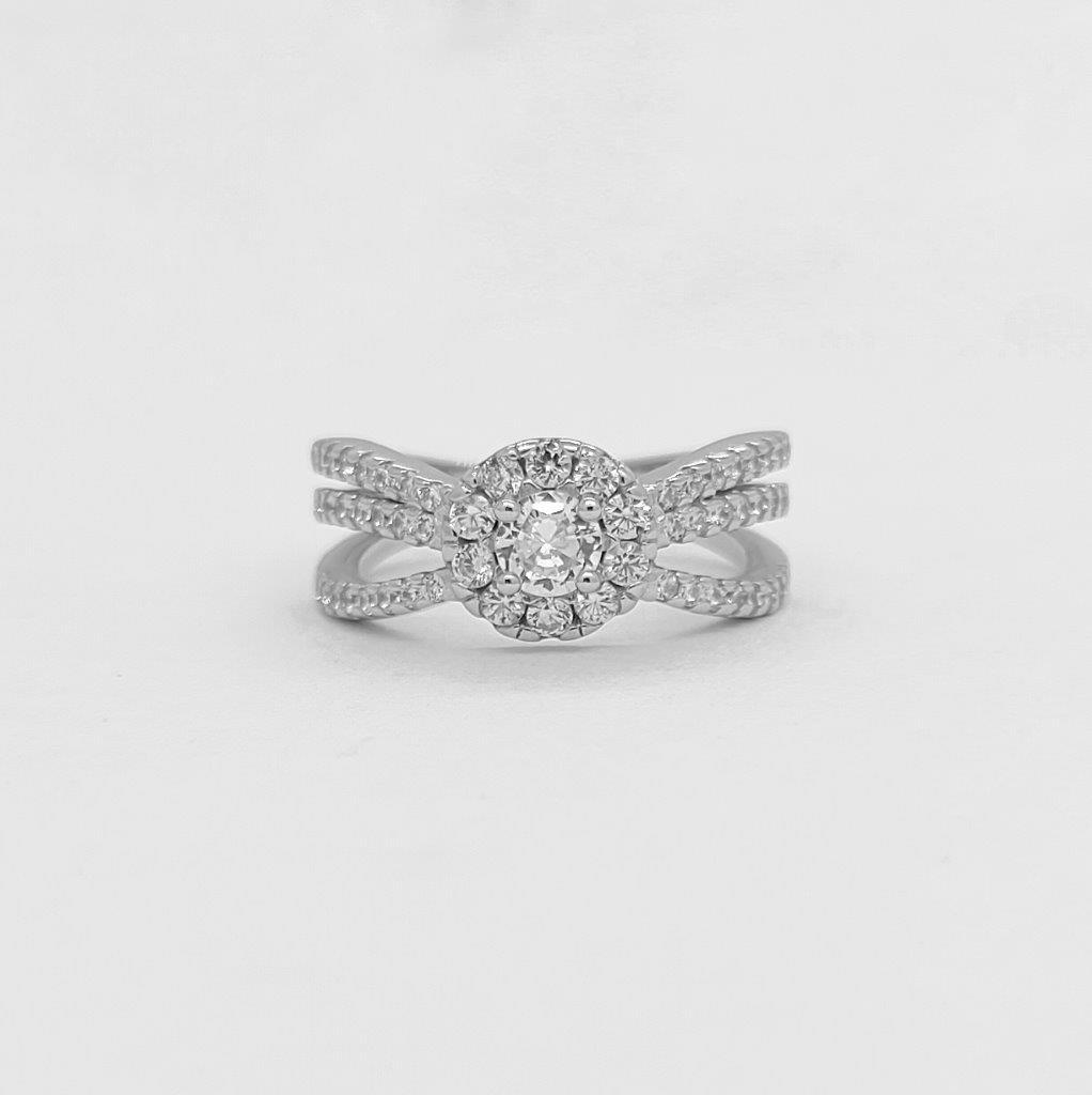 A dazzling halo ring with a split band, featuring cubic zirconia stones, available in rose gold, and white gold color.